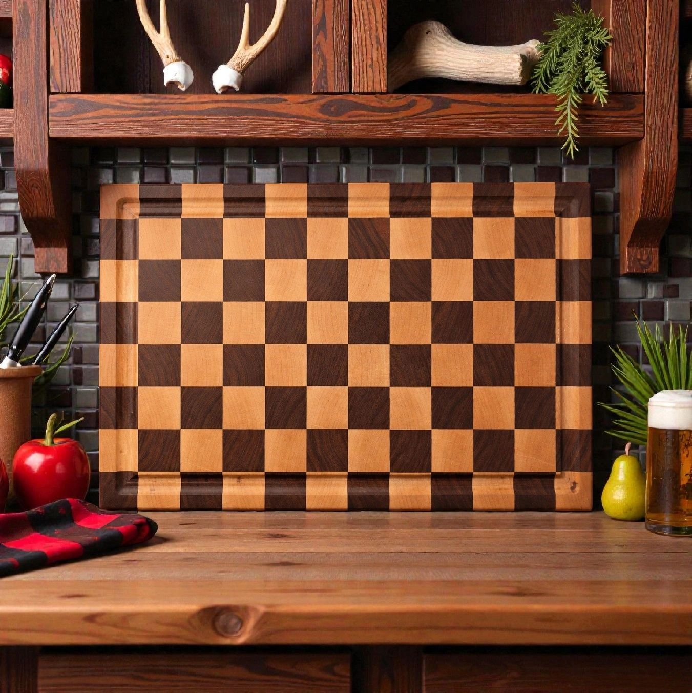 This board is built for serious use and lasting beauty. Hand-assembled from premium black walnut and hard maple, the striking checkerboard end-grain pattern delivers exceptional durability while showcasing bold natural contrast. End-grain construction allows blades to slip between wood fibers, helping knives stay sharper longer and giving the board decades of service with proper care.